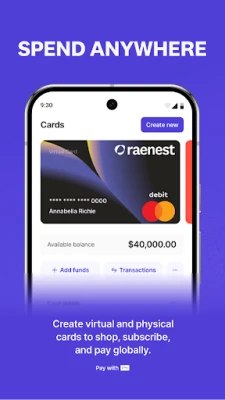 Raenest babban dandali ne na kuɗi na duniya baki ɗaya wanda ke sauƙaƙa karɓa, kashewa, aikawa, zuba jari, da sarrafa kuɗinka a duk faɗin duniya ba tare da wata wahala ba. Ko da a ina kake, Raenest yana ba ka damar samun kayan aikin kuɗi da kake buƙata don shiga cikin tattalin arzikin duniya ba tare da cikas ba. Fiye da masu amfani miliyan ɗaya – mutane ɗaya-ɗaya, masu zaman kansu, masu ƙirƙira, ma'aikata masu nisa, da 'yan kasuwa – tuni suna amfani da Raenest don gudanar da harkokin kuɗin su na duniya.